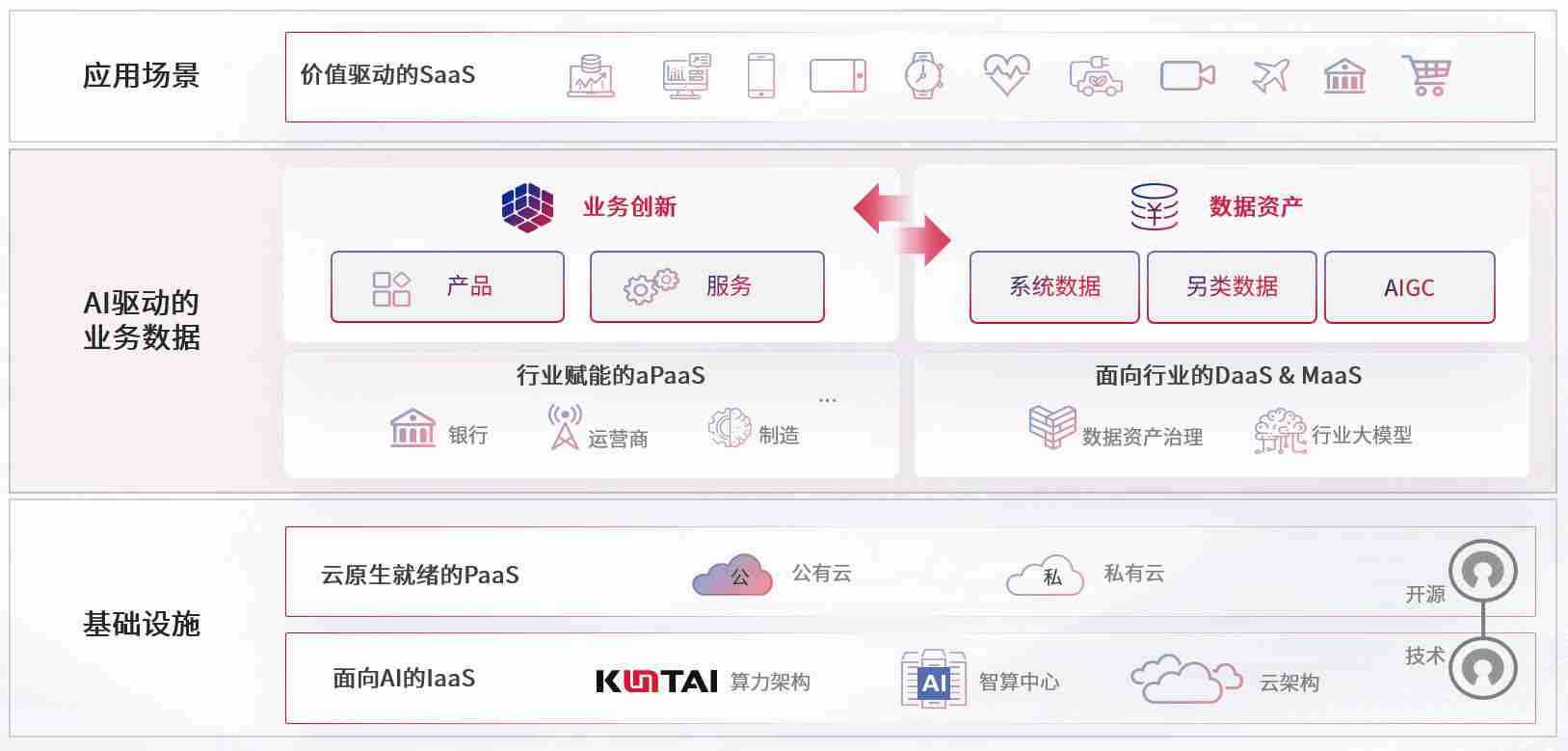 数字时代,,,围绕企业数字化转型的关键要素,,,,NG28数码开创性的提出数云融合战略和技术体系框架,,,,着力在云原生、、数字原生、、、、AI原生和信创产业上架构产品和服务能力,,为处在不同数字化转型阶段的快消零售、、、汽车、、、、金融、、医疗、、、政企、、、教育、、、运营商等行业客户提供泛在的敏捷IT能力和融合的数据驱动能力,,构建跨界融合创新的数字业务场景和新业务模式,,助力企业级客户建立面向未来的核心能力和竞争优势,,,全面推动社会的数字化、、智能化转型升级。。。