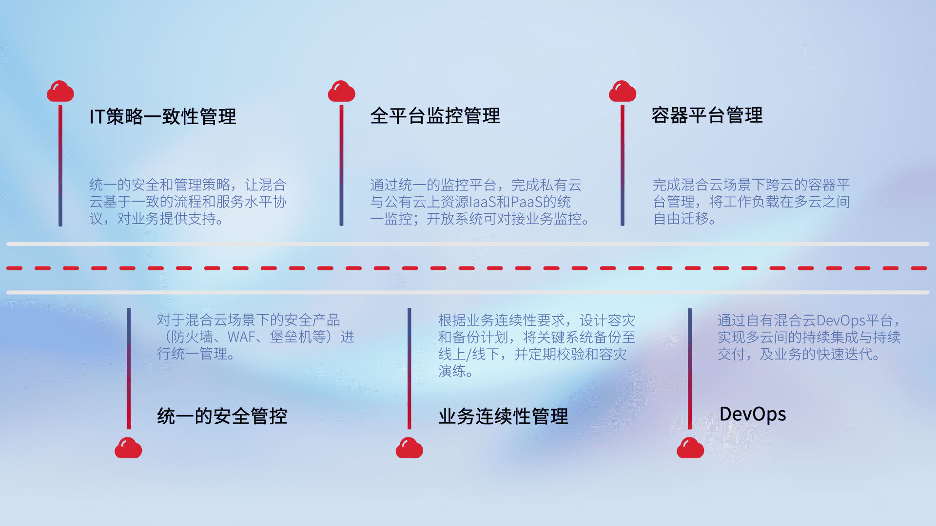 通过多云纳管,,以统一的资源数据模型把客户的云资源进行抽象和封装,,,,进而实现对多云资源的统一操作,,,保障云资源管理的可靠性、、、稳定性与可用性。。量身定制化运维内容,,,,配置、、、、开发运维、、、补丁管理、、、、备份、、监控、、、认证和访问管理、、审计和日常巡检等,,,,保障在用云过程中的可靠度,,稳定度以及高可用率。。